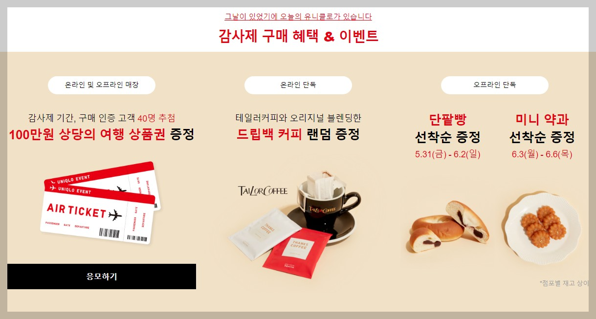 유니클로 감사제는 온라인, 오프라인 모두 동일하게 진행됩니다. 온라인으로 상품을 주문할 경우 감사제 기간동안 테일러 커피 드립백을 증정해 드립니다.