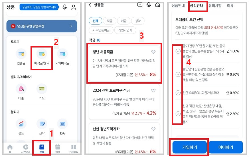 신한은행 청년 처음적금 가입방법, 우대금리 적용 방법(연 최대 8%)