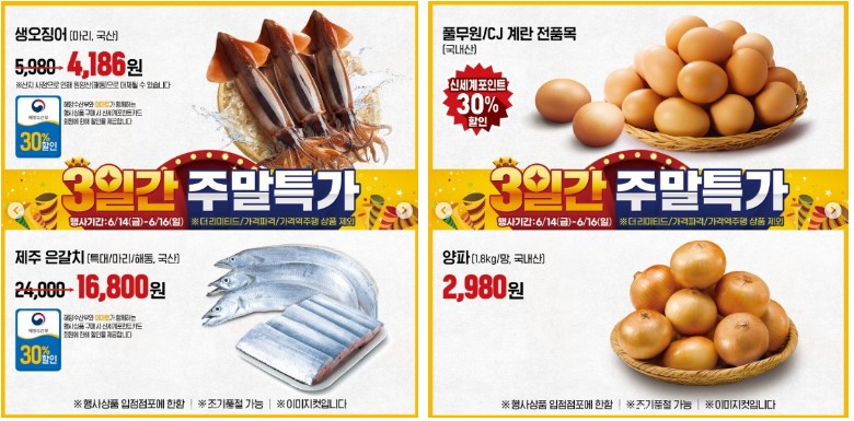 수산물은 국산 생오징어, 제주 은갈치를 30% 세일하고, 우리 식탁에 자주 올라오는 계란과 양파도 할인하니 식재료 쇼핑에 도움이 될 것 같습니다.