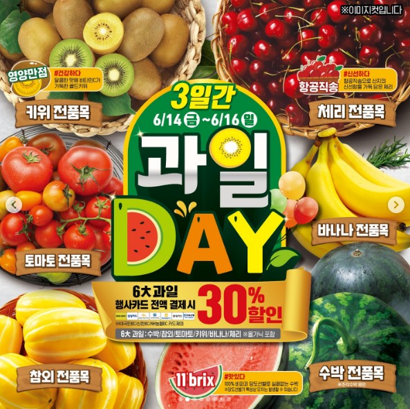 이마트에서는 과일 DAY라는 주제로 6월 14일(금)부터 6월 16일(일)까지 6개 과일 품목에 대해 30% 할인을 진행합니다.