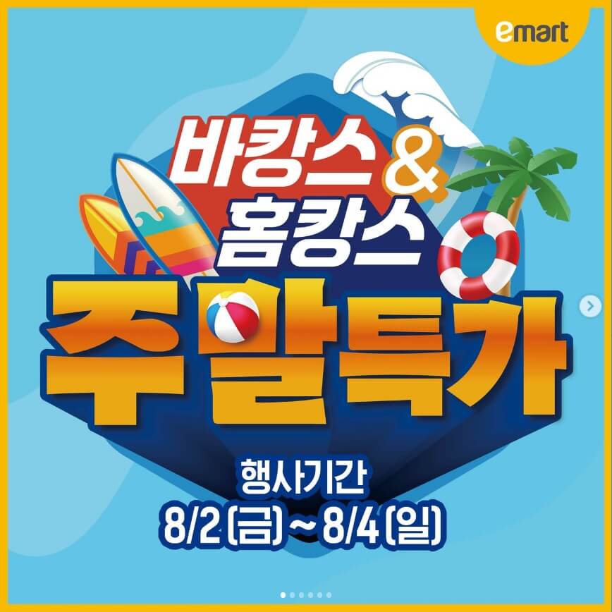 이번주 이마트는 바캉스&홈캉스라는 주제로 주말 세일을 진행하는데요, 휴가철에 맞는 상품들을 세일하고 있으니 여행 떠나기 전 이마트에서 알뜰 장보기 하시며 즐거운 휴가 즐기시길 바라겠습니다.