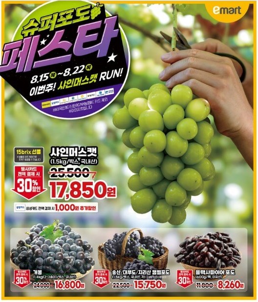 이번주 이마트에서는 제철을 맞은 다양한 종류의 포도를 할인 판매합니다. 샤인머스캣부터 거봉, 포도를 할인행사합니다.