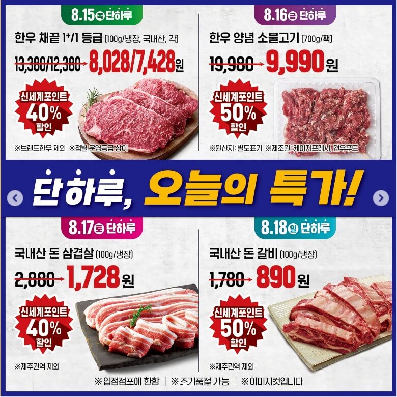 이번주 이마트에서는 쿨 썸머를 테마로 8월 15일(목)부터 18일(일)까지 주말특가 세일을 4일간 진행합니다. 한우부터 라면, 포도, 키위, 달걀, 생필품 등 다양한 품목을 50% 할인행사 하니, 전단내용 확인하시고 알뜰 쇼핑 하시길 바랍니다.