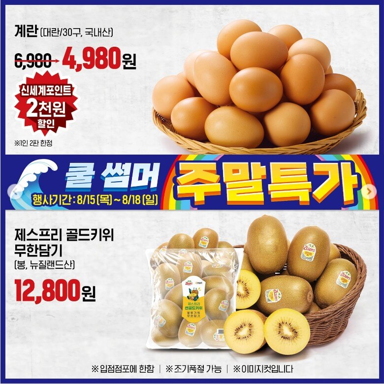 이 밖에도 대란이 4,980원, 골드키위는 한 봉지에 무한 담기 행사를 진행하니, 확인해 보시기 바랍니다.