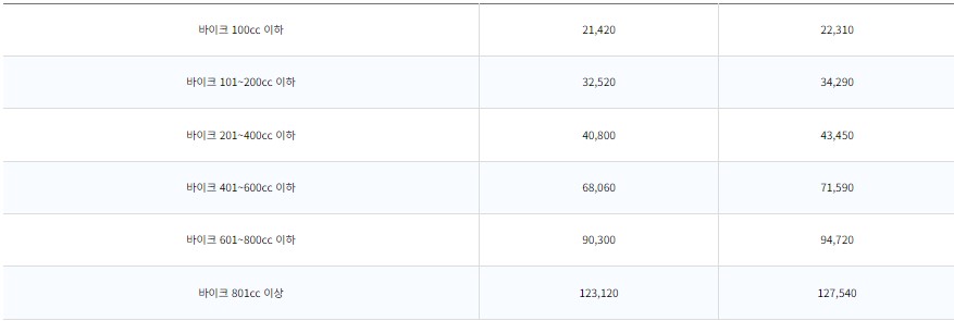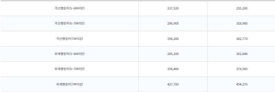 차량요금은 차량 종류에 따라 다르고, 바이크와 캠핑카를 포함해 세분화되어 있습니다.