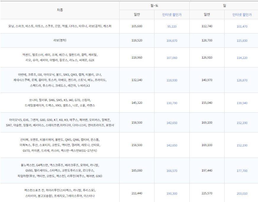 - 위의 차량 요금들은 편도요금이 하계특송기간은 할인이 적용되지 않습니다.
