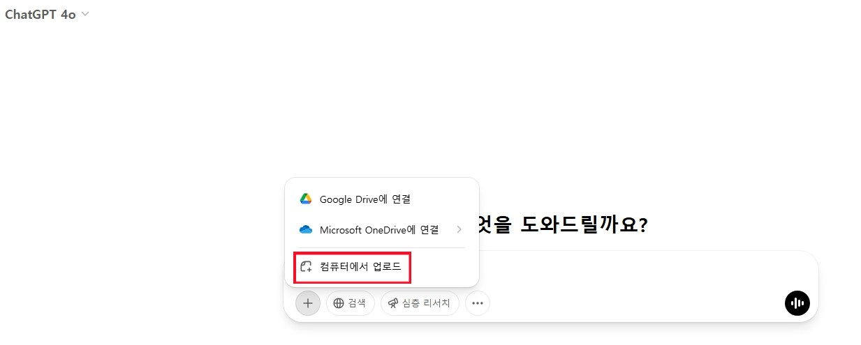 먼저, 챗GPT에 로그인 후 새 채팅에서 '+'버튼을 누르고 바꾸고 싶은 사진을 업로드한다.