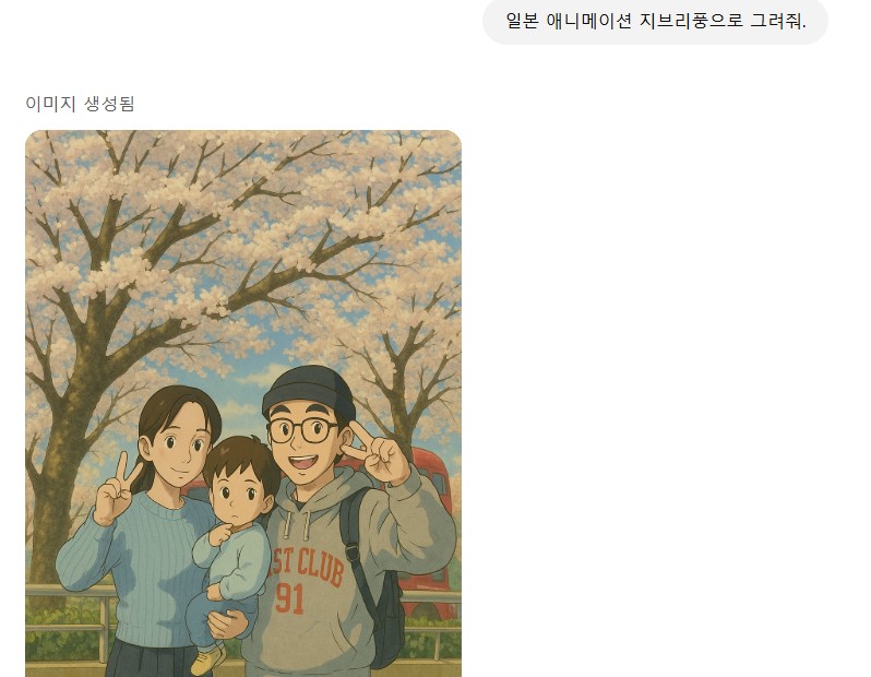 그리고 명령어를 '사진을 지브리 애니메이션 스타일로 그려줘' 또는 '지브리 스타일로 바꿔줘'라고 하면 그림이 완성된다.