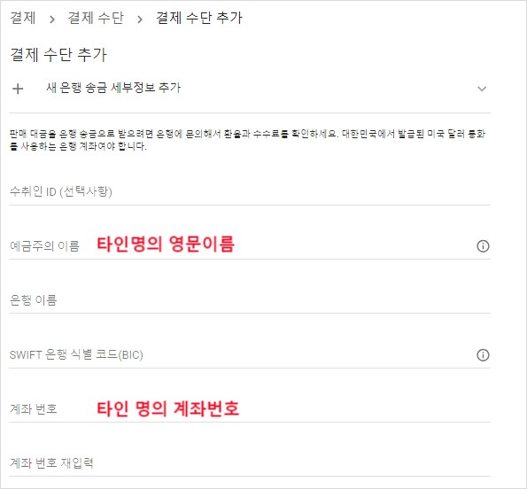 지급받을 방법 - 결제 수단 추가 - 새 은행 송금 세부정보 추가를 눌러 주면 사진과 같은 화면이 뜹니다. 여기서 예금주 이름을 타인명의 영문이름을 작성하고 계좌번호도 타인명의 계좌번호를 입력합니다.
