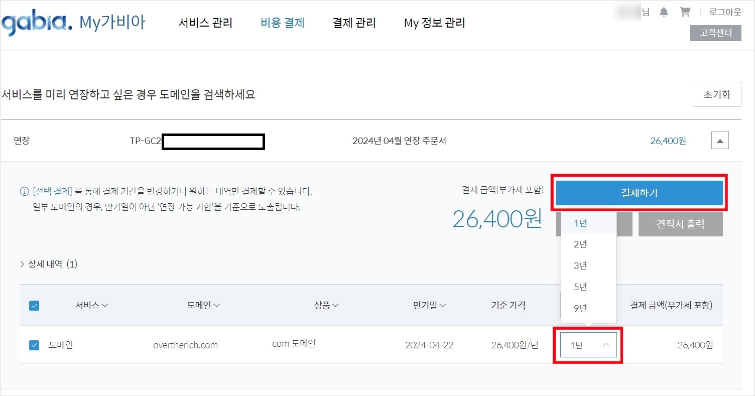 가비아 도메인 연장하는 방법, 비용, 기간 지났을 때