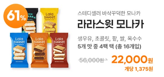 라라스윗 모나카도 초코바와 동일하게 정가 3,500원에서 61%할인된 가격인 개당 1,380원에 구매할 수 있습니다. 맛은 생우유, 초콜릿, 팥, 쌀, 옥수수 5개 맛 중에서 4팩을 선택해 구매할 수 있습니다.