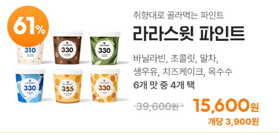 라라스윗 저당 아이스크림의 시작을 알린 파인트는 정가 9,900원에서 61% 할인된 3,900원에 구매할 수 있고, 바닐라빈, 초코, 말차, 생우유, 치즈케이크, 옥수수 6개 맛 중 4개를 고를 수 있습니다.