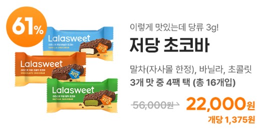 요즘 가장 유명한 저당초코바는 정가 3,500원에서 61% 할인된 가격인 1,380원에 구매할 수 있습니다. 말차, 바닐라, 초코맛 3가지 중 4팩을 선택할 수 있습니다.