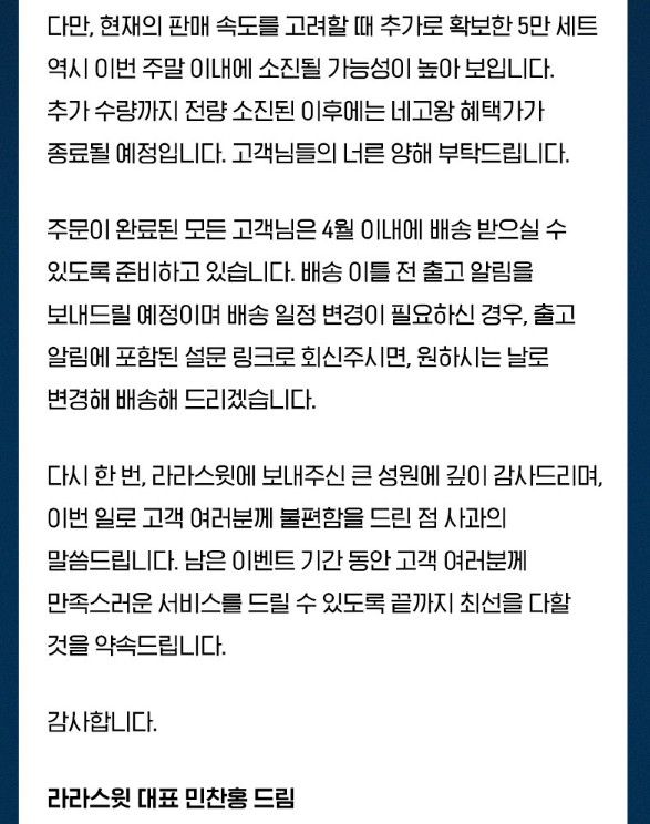 - 주문폭주로 인해 배송이 지연될 수 있음