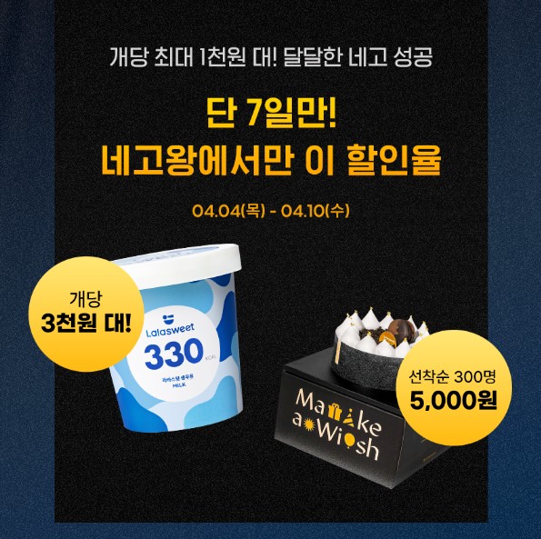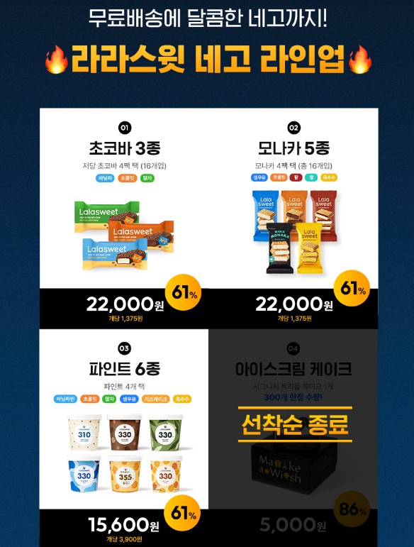요즘 없어서 못판다는 라라스윗 초코바를 포함해 모나카, 파인트, 아이스크림케이크, 저당 생크림롤을 네고 판매합니다. 아이스크림 케이크는 선착순 300명, 5,000원에 판매하였고, 저당생크림롤은 선착순 300명 무료증정 했습니다. 선착순 300명이벤트는 시작과 동시에 빠르게 마감되었습니다.