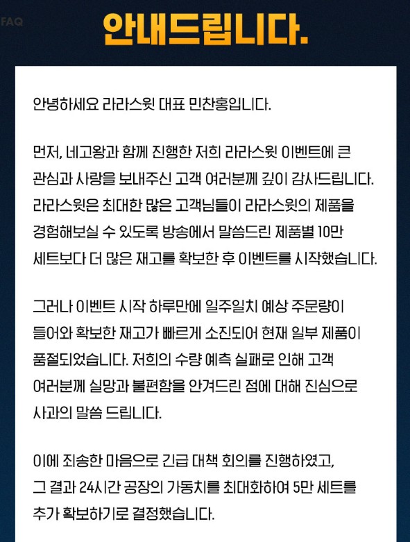라라스윗이 너무 인기있다보니 일주일 물량이 하루만에 주문이 들어와 공장을 풀가동하고 추가로 재고를 확보한다고 합니다. 네고광 이벤트의 기간은 1주일이지만, 추가확보한 물량도 소진이 되면 이벤트가 조기마감 될 수 있습니다. 평소에 라라스윗을 자주 드시거나, 드셔보고 싶으신 분들은 이벤트 기간이 남았더라도 조기마감될 수 있으니 서두르시기 바랍니다.