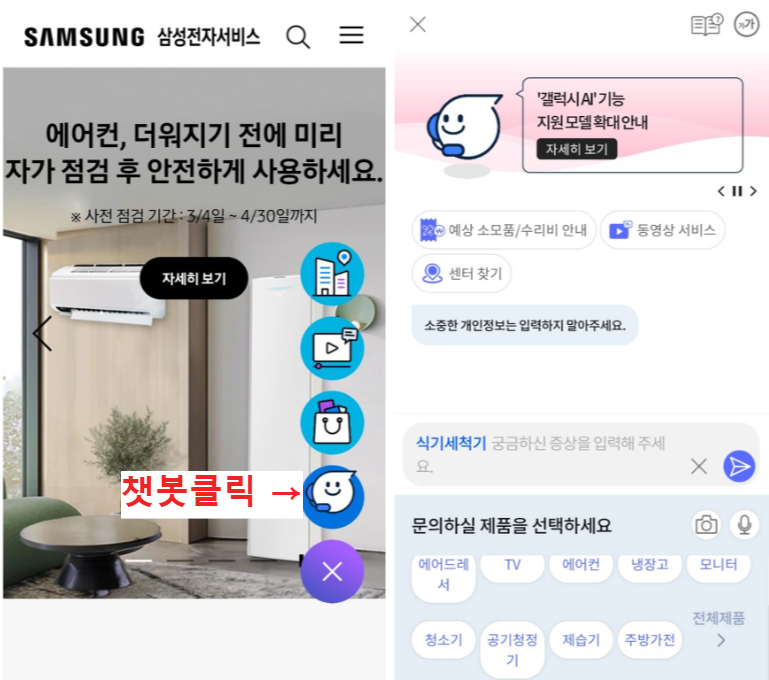 삼성 서비스센터를 검색해 들어가 보면 복잡하게 되어 있다는 느낌이 듭니다. 하지만 요즘 모바일 챗봇을 이용하면 간편하게 A/S 예약을 하실 수 있습니다.