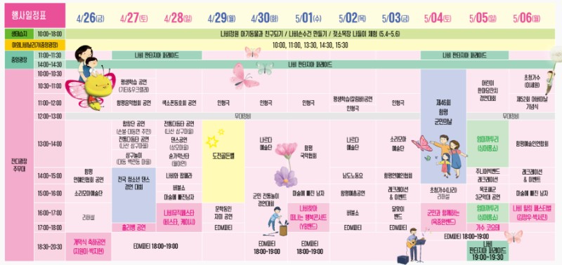 - 행사 내용: 개막 폐막 축하공연, 나비 날리기 체험, 나비 놀이터, 동물 먹이주기 등