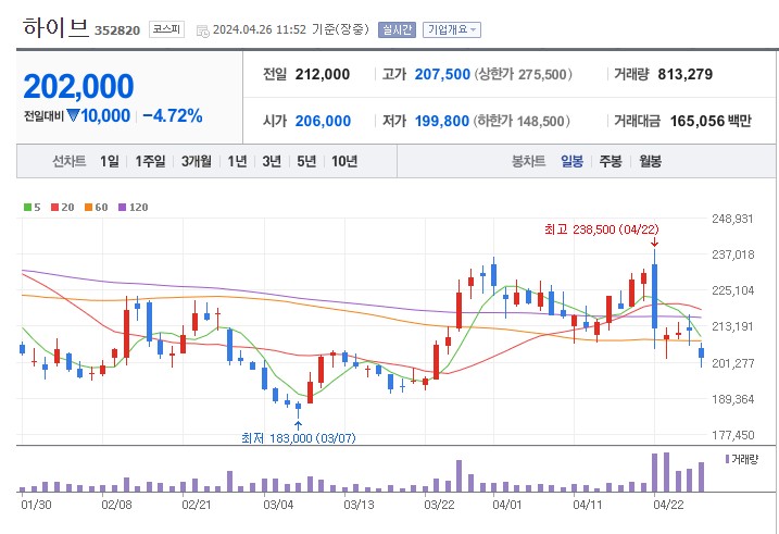 이번 사태로 인해 하이브 주가는 계속해서 빠지고 있는 상태입니다. 대국민의 관심이 쏠린 이 사태가 잘 해결되길 바라며, 주주의 입장에서도 얼른 이 사태가 해결되어 주가가 회복되었으면 좋겠습니다.