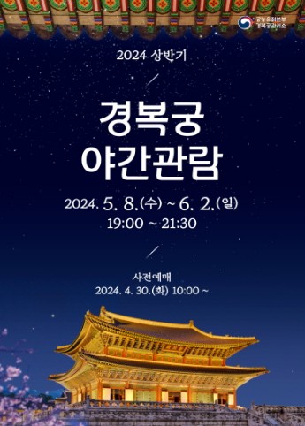 2024 상반기 경복궁 야간개장은 5월 8일부터 6월 2일까지 한시적으로 운영이 되고, 사전 인터넷예약을 통해서 입장권 구매가 가능합니다. 야간개장을 방문하시고 싶으신 분들은 예약 가능 날짜를 미리 확인하셔서 티켓 구매하시면 좋을 것 같습니다. 경복궁은 매주 월요일, 화요일에는 휴무이고 5월 17~19일 사이에는 야관관람이 없으니 일정 참고하시길 바랍니다.