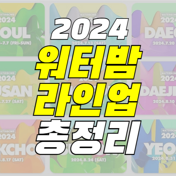 2024년 워터밤 라인업이 공개되었습니다. 올해 워터밤은 7월 5일 서울을 시작으로 제주, 대구, 부산, 인천, 대전, 속초, 수원, 여수 총 9개 도시에서 열립니다. 어떤 가수들이 각 지역 워터밤에 오는지 워터밤 2024 라인업을 알아보겠습니다.